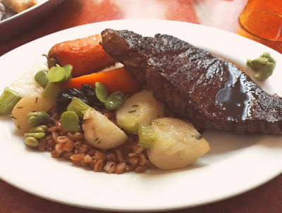 Le plat de ce jour: une Noix de basse-côte grillée, sauce teriyaki à l'ail, épeautre et légumes printaniers lui n'a pas encore son visa. Entre 2 continents, il émigre en laissant une partie de sa fortune au point de départ. Une belle viande trop cuite et donc trop sèche, un épeautre abandonné à son rôle d'accompagnant. J'ai encore l'odeur de la cuisson sur les vêtements. L’intérêt résidait dans ces légumes (le printemps est plus dans l’assiette que dans les airs en ce moment) croquant, à peine cuit comme ces formidables navets; et dans la sauce soja, rapadura, ail confit au four, pas trop réduite.