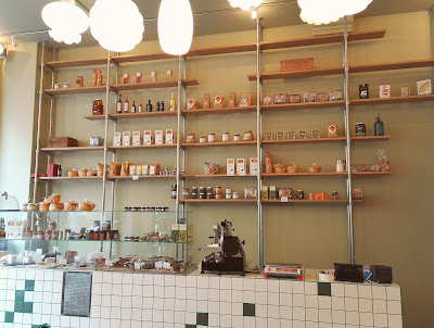 Dans son plus simple appareil, comme à la maison, mais entouré de trésors dignes des tombeaux égyptiens, ou même d'un office, d'un souillard ou d'un économe intelligemment achalandé. De bonnes confitures ou miel, des granolas, des olives et de l'huile (Profil Grec), des légumes secs, du pain et des pâtes sardes, de la charcuterie terroir et des fromages au lait cru dans la vitrine dédiée, pleins de saveurs. A des tarifs qui vont du correct (limonade Mortuacienne à 2€, comme l'expresso de l'Arbre à Café préparé sur Jura...) au plus cher (Pane carasatu à 8.50€, Toast for cheese à 6€). C'est une épicerie.